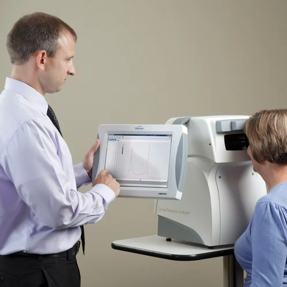 Аналізатор біомеханічних властивостей ока Ocular Response Analyzer (ORA, Reichert Inc., США) є безконтактним тонометром, який працює за принципом динамічної двобічної апланаціі (сплощення) рогівки. Реєструються два значення внутрішньоочного тиску, різницю між якими прийнято називати корнеальним гістерезисом.