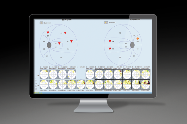 Кластерний аналіз поєднує високу чутливість із хорошою специфічністю. Тестові місця згруповані вздовж пучків нервових волокон, щоб краще проаналізувати зміни в важливих областях, таких як носова сходинка або макула. Це усуває трудомісткий метод підрахунку ізольованих точок. Комбінований графік ймовірності/відхилення висвітлює патологічні області.